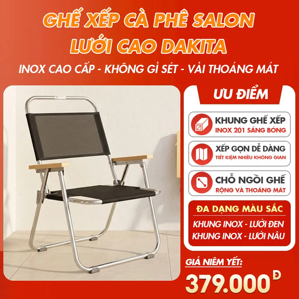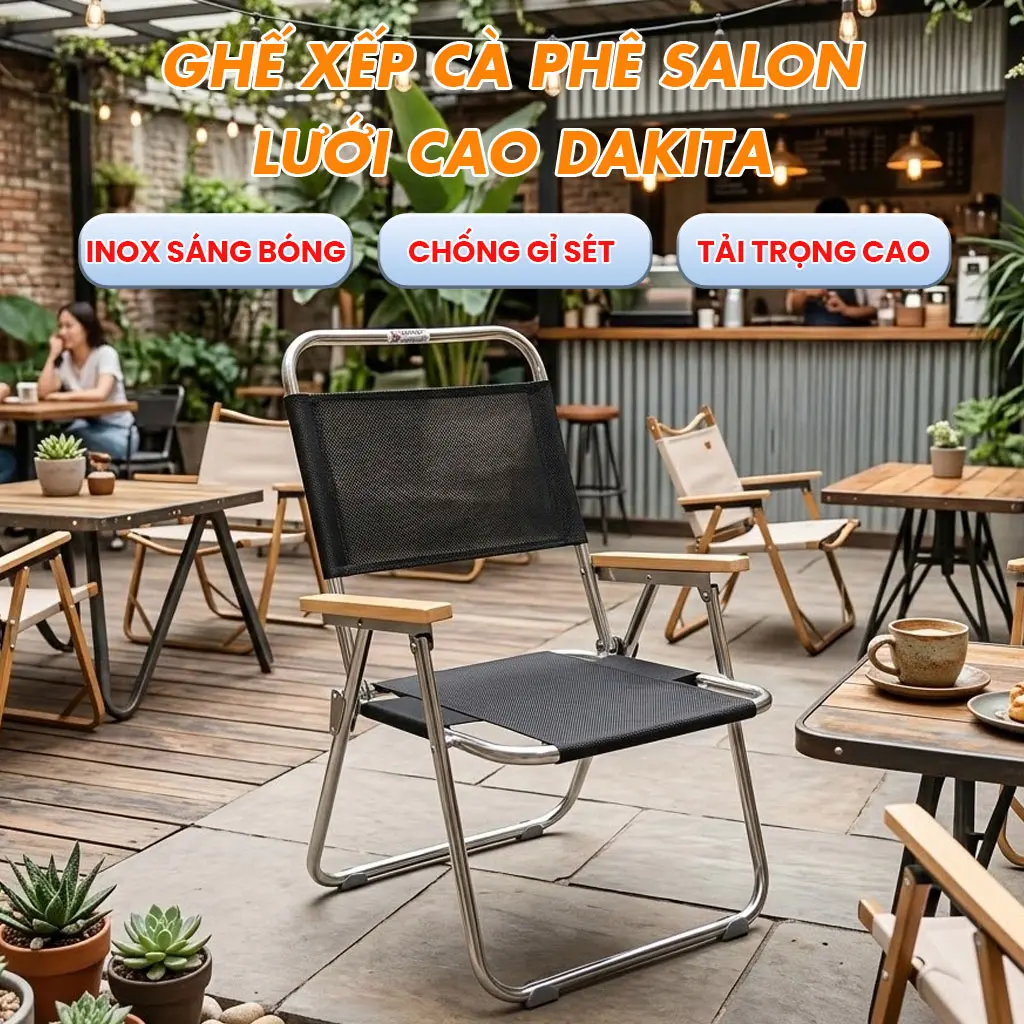 Ghế Salon Inox khung sườn inox sáng bóng, chống gỉ sét, chịu tải cao, không còn nỗi lo khung mỏng dễ gãy. Mặt ngồi và lưng lưới cao cấp thoáng khí, ngồi lâu không bí nóng. Trọng lượng nhẹ, dễ gấp gọn, mang theo tiện lợi, phù hợp cho gia đình, sân vườn, quán café hay du lịch ngoài trời.