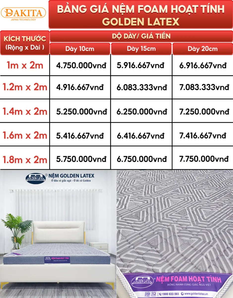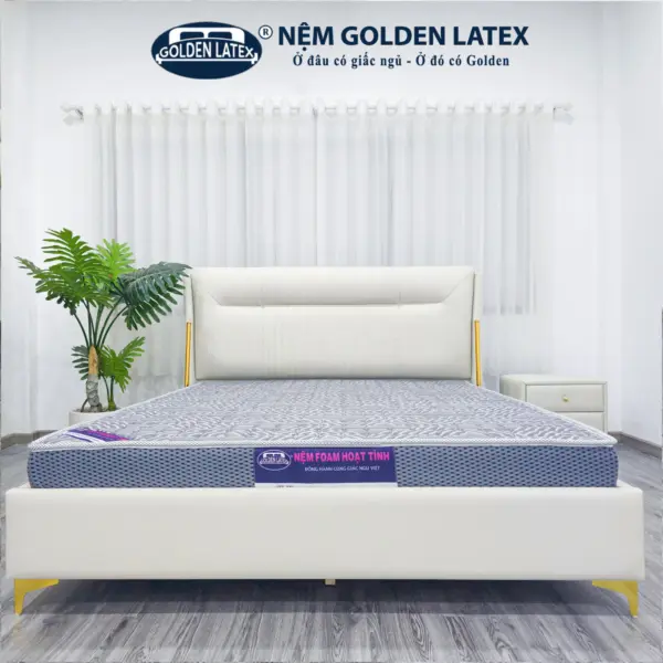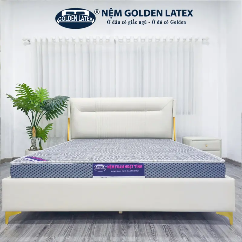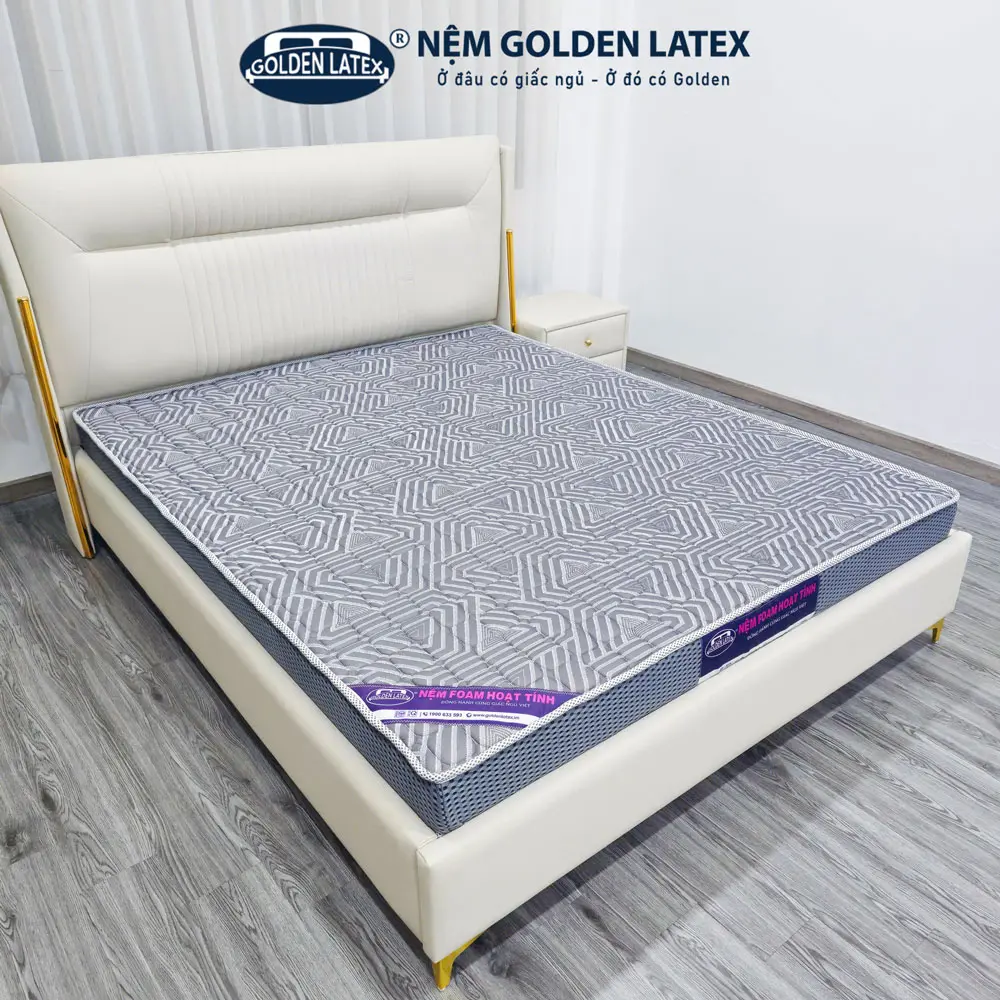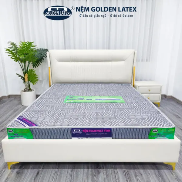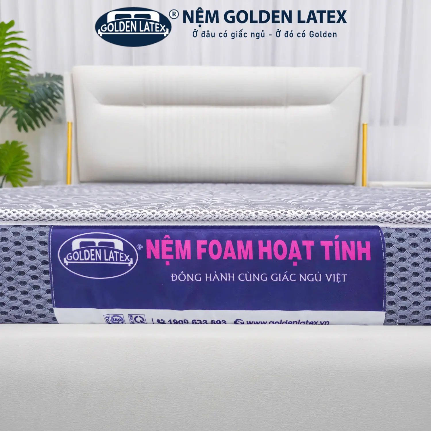 Nệm Foam hoạt tính Golden Latex được làm từ Mousse Foam và Memory Foam. Quy trình sản xuất dựa trên các tiêu chuẩn an toàn cho sức khỏe người dùng, tính ứng dụng cao, có độ bền từ 10-15 năm. Sản phẩm lành tính cho làn da, cực kỳ an toàn cho sức khỏe người tiêu dùng.