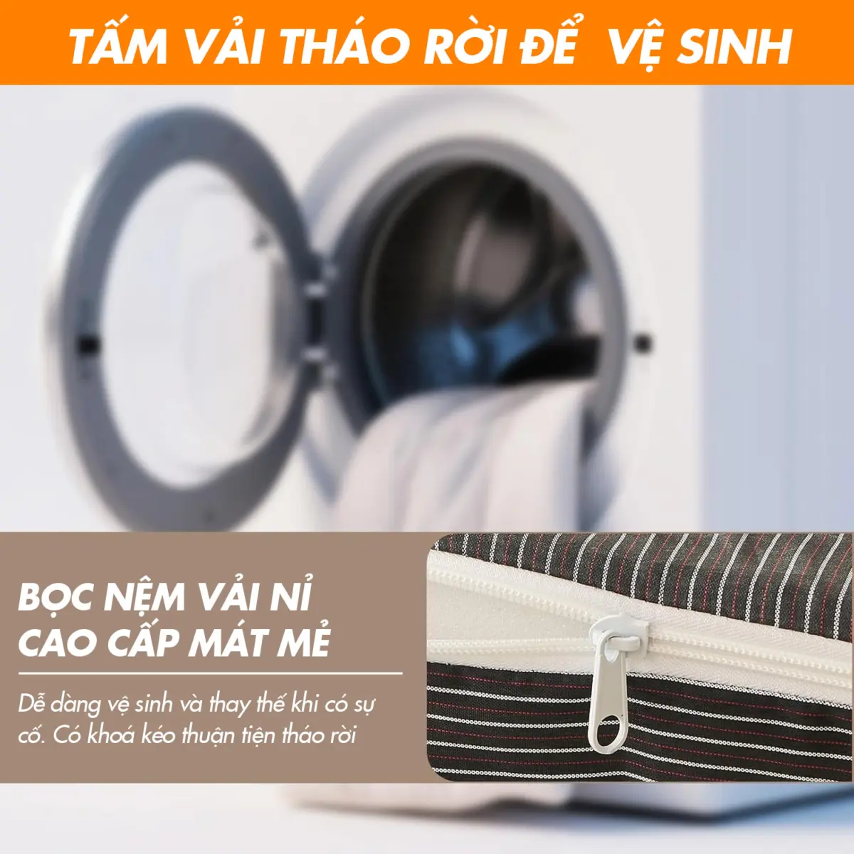 – Vải giường: Vải cotton ( thoáng khí, không bóng, không bám bụi).