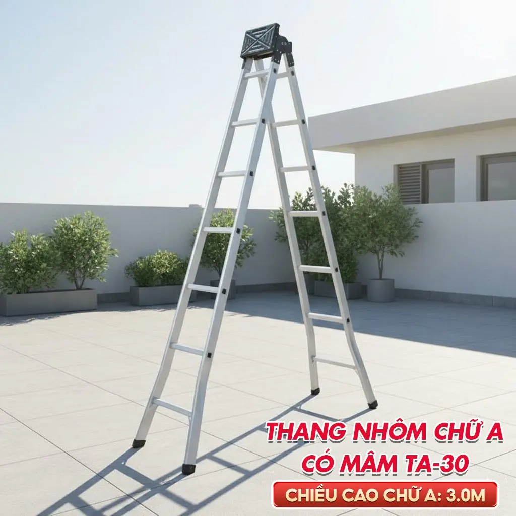 Ưu điểm thang chữ A phổ thông: Thang nhẹ, nhôm dày, Có mâm (ghế) ngồi trên đỉnh thang giúp cho quá trình làm việc đỡ mệt mỏi, vừa sử dụng được chữ A, làm việc ở những nơi không có điểm tựa, lẫy khoá tự động vô cùng an toàn khi sử dụng