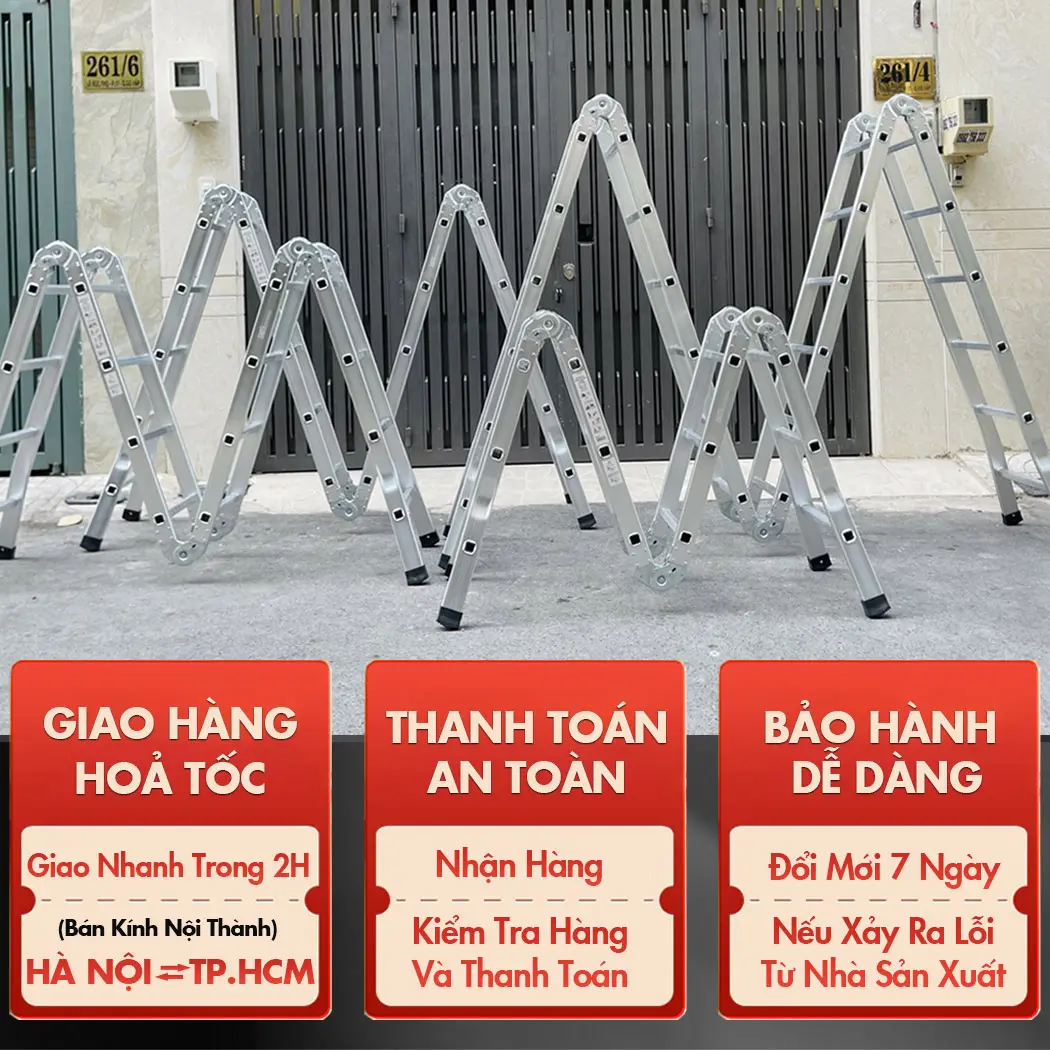 Kiểu dáng: Thang nhôm gấp làm 4 đoạn, sử dụng được nhiều kiểu dáng: chữ A, duỗi thẳng chữ I, chữ M, U, L. Xếp gọn khi không sử dụng.