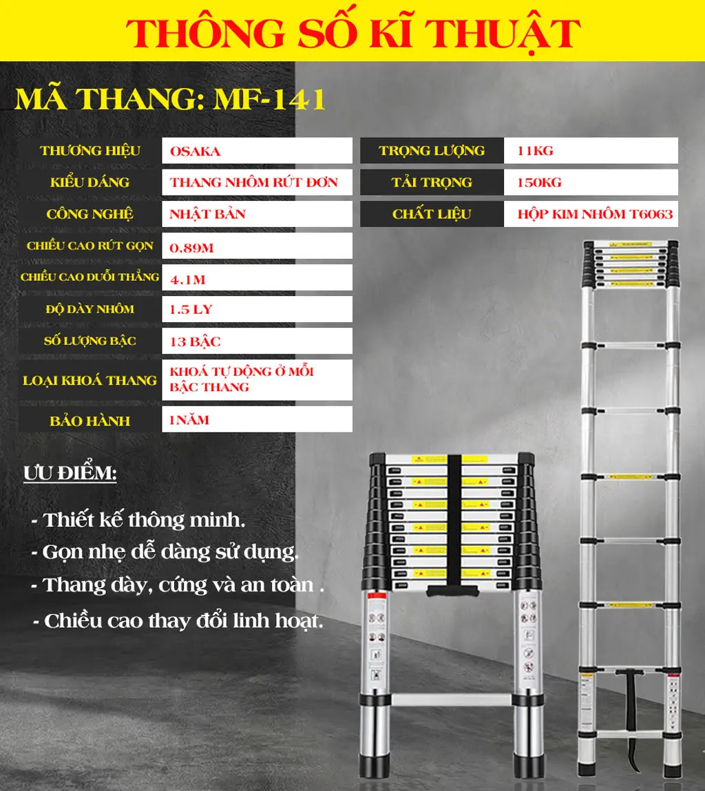 THANG NHÔM RÚT GỌN OSAKA-141 CHÍNH HÃNG – THANG TỐT – GỌN – NHẸ – XÀI BỀN.