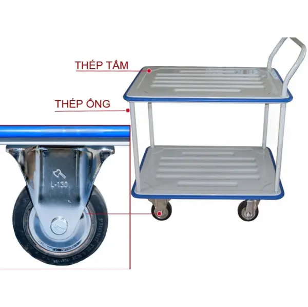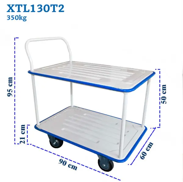 Xe đẩy hàng 4 Bánh XTL 130T2 thuộc dòng xe đẩy hàng 4 bánh tải trọng 350kg, Xe đẩy hàng 4 bánh XTL130T2 sử dụng nhiều trong các lĩnh vực sản xuất để vận chuyển hàng hóa. Trọng lượng của xe: 36 kg với kích thước sàn xe: 560×860 mm phù hợp khi để cả những vật cồng kềnh. Chiều cao tay đẩy 960 mm thân thiện với người dùng.