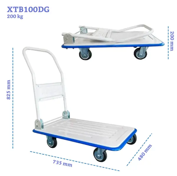 Xe đẩy hàng 4 bánh XTB 100DG mẫu xe đẩy hàng 4 bánh gấp gọn của Phong Thạnh, kích thước dài 735cm, rộng 480cm dùng để kéo đẩy hàng hóa giúp giảm thiểu sức người và nâng cao năng suất lao động, thích hợp sử dụng trong nhà xưởng, công ty, siêu thị, cửa hàng bán lẻ…