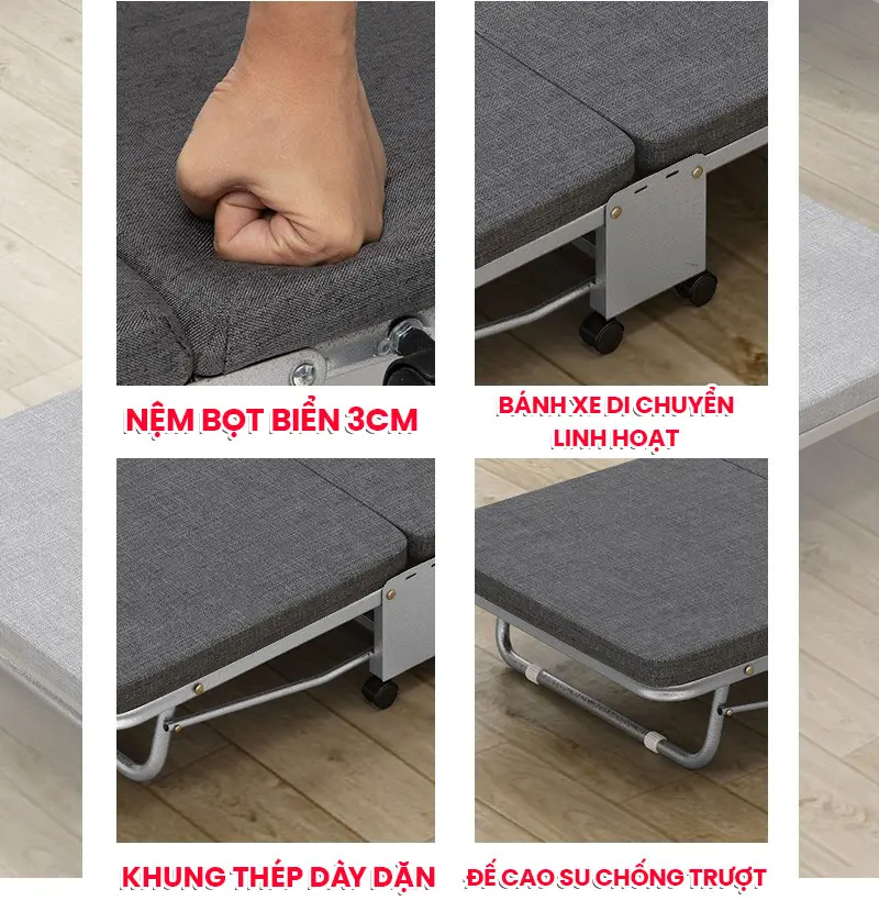 Ưu điểm: Nệm nằm êm, ngủ ngon, nhẹ, thiết kế cơ động đa năng, có thể gấp thành ghế ngồi hoặc gấp gọn khi không sử dụng, GIÁ RẺ